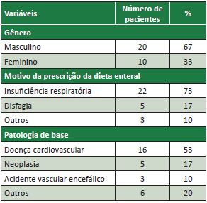 Para ilustrar a realidade da TNE no cenário brasileiro, foi feita pesquisa de campo envolvendo pacientes em nutrição enteral em hospital universitário de Curitiba. Foram avaliados 30 pacientes, com média de idade de 62±11, 21 anos. A maior parte dos avaliados em TNE foi internada devido a doença cardiovascular (53%, n=16), seguido de neoplasia (17%, n=5) e acidente vascular encefálico (10%, n=3), conforme Tabela 1. Outras patologias observadas nos pacientes foram sepse, insuficiência respiratória, aneurisma e cirurgia bariátrica, representando 20% do diagnóstico clínico (n=6).