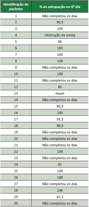 A dieta infundida foi adequada com base na análise dos registros de seus volumes diários durante o período em que o paciente passou por esse procedimento. Considerou-se também a suplementação nutricional industrializada via oral ou nutrição parenteral complementar (incluindo soro glicosado) para determinar macro e micronutrientes administrados. A quantidade energética desses nutrientes fornecida no quarto dia de recebimento da dieta foi comparada às necessidades nutricionais do paciente para análise da adequação.