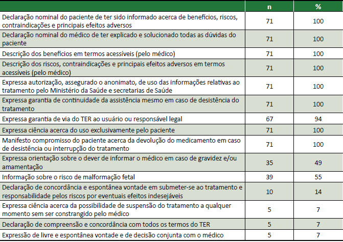 Elementos excepcionais aos quais cabem menções específicas incluem previsão de preenchimento dos TER em duas vias, uma das quais deve ser entregue ao paciente ou a seu representante legal (apenas quatro deles não apresentam este item); a declaração de “concordância e espontânea vontade” em submeter-se ao tratamento com a responsabilidade por eventuais efeitos indesejáveis assumida pelo paciente (constante em dez termos); a expressão da possibilidade de suspensão do tratamento a qualquer momento sem ser constrangido pelo médico; declaração de compreensão e concordância com todos os termos; e expressão de “livre e espontânea vontade e de decisão conjunta com o médico”, esses três últimos constando em cinco documentos.