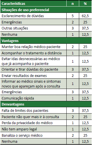 Entre as situações de uso preferencial do WhatsApp citadas pelos entrevistados (Tabela 1) estão esclarecimento de dúvidas (62,5%), emergência (25%) e outras situações não especificadas (37,5%). É importante considerar que os entrevistados poderiam marcar mais de uma opção. Além de comporem a categoria “uso preferencial”, o esclarecimento de dúvidas e o uso em algum tipo de emergência médica também foram considerados na categoria “vantagens” (ambos citados por 37,5% dos médicos).