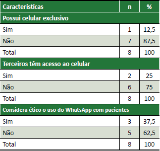 Ademais, o questionário perguntava a especialidade do médico, se utiliza ou não o WhatsApp como meio de comunicação com pacientes e, se sim, com qual finalidade e em que situações o faz. Além disso, avaliou a frequência de uso da ferramenta. O questionário buscou também abordar a opinião desse profissional em relação à eticidade do aplicativo na relação com o paciente. Após 12 minutos os pesquisadores retornaram ao ambulatório a fim de recolher os questionários preenchidos. Foram obtidas informações de quatro pediatras e quatro obstetras. A coleta e análise dos dados foi realizada pelos pesquisadores responsáveis.