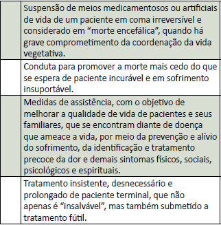 A ortotanásia é reconhecida pela Resolução do Conselho Federal de Medicina (CFM) 1.805/2006 4. É definida como a suspensão de procedimentos e tratamentos que prolonguem a vida do paciente terminal, respeitando a vontade da pessoa ou de seu representante legal 4. Em pacientes com possibilidade de cura, medidas mais invasivas devem ser tomadas, mesmo que tragam algum grau de sofrimento, pois, nesse caso, a beneficência deve sobrepor-se à não maleficência. O que a ortotanásia propõe é a restrição dessas medidas em pacientes sem expectativa de cura, situação na qual o princípio da não maleficência deve prevalecer 5.