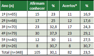 Quando perguntados sobre os conceitos referentes à terminalidade (ortotanásia, distanásia, eutanásia e cuidados paliativos), a taxa de acertos foi de 72,4%, 85,6%, 85% e 97,4%, respectivamente. Do total, 251 (72,1%) alunos acertaram todos esses conceitos, sendo essa taxa crescente entre o 1º e 3º ano (de 58,5% no 1º a 78,5% no 3º), decréscimo no 4º e 5º anos (69,6% e 75%, respectivamente), e o 6º ano alcançando 96,2% (p=0,00863, pelo teste qui-quadrado). Sobre a Resolução CFM 1.805/2006, que trata da ortotanásia, apenas 6% afirmaram conhecê-la.