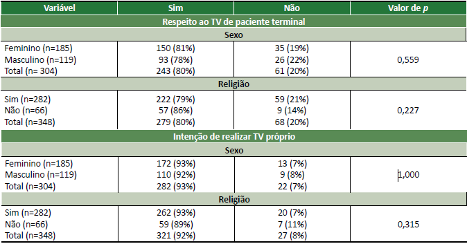 Quando questionados sobre a hipótese de lidar com paciente terminal que apresentasse TV, 279 (80,1%) respeitariam a decisão do enfermo nesse caso. A resposta positiva para a intenção de fazer TV para si foi maior (92%). Para esta pergunta houve mais equilíbrio entre os sexos e entre os que seguem ou não uma religião, porém sem significância estatística. A Tabela 2 mostra a associação entre essas questões.