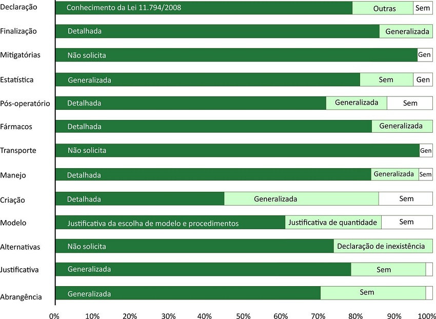 A comparação entre instituições públicas e privadas quanto à aplicação das normas da DBCA antes de sua implementação 21 não atestou diferenças significativas. Além disso, predominaram solicitações vagas ou generalizadas sobre a relevância e justificativa do projeto e foram poucos os pedidos de análise de riscos e atitudes mitigatórias, fiscalização, métodos alternativos e transporte. Contudo, evidenciou-se foco no desenho estatístico e na caracterização do modelo animal, nos fármacos, pós-operatório e eutanásia/destino (Figura 1). O termo de responsabilidade estava desatualizado em 8,5% das instituições e ausente em 17,5%.