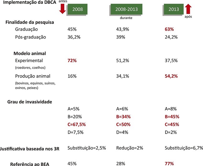 As análises dos protocolos submetidos antes, durante e após a implementação da Lei 11.794/2008 21, que estabelece procedimentos para o uso científico de animais, atestaram sua efetividade na diminuição de estudos experimentais, promoção de menor grau de invasividade e aumento do número de referências ao BEA. Esses resultados retratam realidade superada pela Resolução Normativa Concea 27/2015 21, cujas orientações mais completas frisam a integridade do pesquisador e da Ceua em prezar prioritariamente pela aplicação do princípio dos 3R e promoção do BEA em cada etapa da pesquisa. Com isso, o pesquisador deve assumir a responsabilidade de preencher corretamente o protocolo e, munido de elementos técnicos e éticos, abster-se do intuito de responder de maneira apenas burocrática 25.