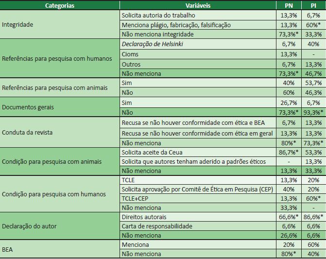 As políticas editoriais de PN diferiram das de PI em aspectos como documentos de pesquisa com humanos e questões relacionadas ao BEA. Quanto à integridade da pesquisa, nove PI mencionaram falsificação, fabricação, plágio, autoria e honestidade quanto à validade dos resultados, enquanto apenas dois PN o fizeram. Embora a maioria das revistas tenha solicitado aprovação de Ceua, nenhuma dessas declarava recusar artigo que não atendesse a padrões éticos ou BEA. Igualmente, muitos periódicos não solicitavam conformidade com documentos específicos ou indicavam preocupação com dor, desconforto ou atendimento ao BEA (Tabela 1).