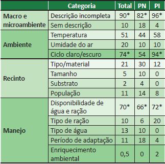 A análise dos textos considerou os seguintes itens: 1) documentos e diretrizes relacionados ao delineamento metodológico; 2) parâmetros éticos; 3) descrição do macro e microambiente, considerando tipo de ambiente, alojamento, nutrição, hidratação, manipulação, população e promoção de enriquecimento ambiental.