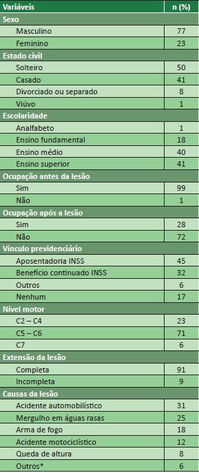 A amostra foi composta predominantemente por homens em idade produtiva, solteiros, com ensino médio, mas que passaram a ficar ociosos após a lesão (nível motor entre C5 e C6). O perfil da amostra segue o confirmado por estudos anteriores: exposição a situações de risco, como acidentes de trânsito, com arma de fogo e quedas 13,18,24-26, causas mais comuns desse tipo de lesão em grupos socialmente vulneráveis e expostos à violência urbana e ao emprego informal. Quanto ao nível de escolaridade, a vulnerabilidade social a que muitos indivíduos com tetraplegia estão sujeitos, para além da debilidade física da condição clínica, aumenta a suscetibilidade a acidentes e pode dificultar também a continuidade dos estudos após a lesão, justificando a alta prevalência de participantes com ensino fundamental e médio.