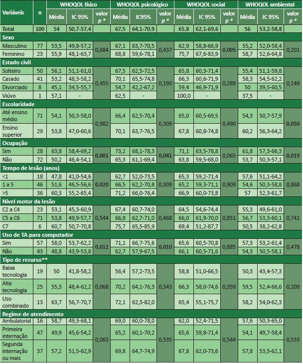 Os resultados evidenciaram maiores escores de qualidade de vida, envolvendo pelo menos um dos quatro domínios investigados pelo WHOQOL-bref, para os participantes do sexo feminino, com níveis de escolaridade mais elevados, que tinham alguma ocupação, com mais de cinco anos de lesão e que utilizavam TA para acessar computadores. Não foram observadas diferenças com significância estatística nos escores de qualidade de vida de usuários e não usuários de TA, quando comparados por nível e extensão da lesão. Este resultado pode estar associado ao fato de a amostra ser composta apenas por pessoas com tetraplegia e, portanto, com comprometimento motor semelhante.