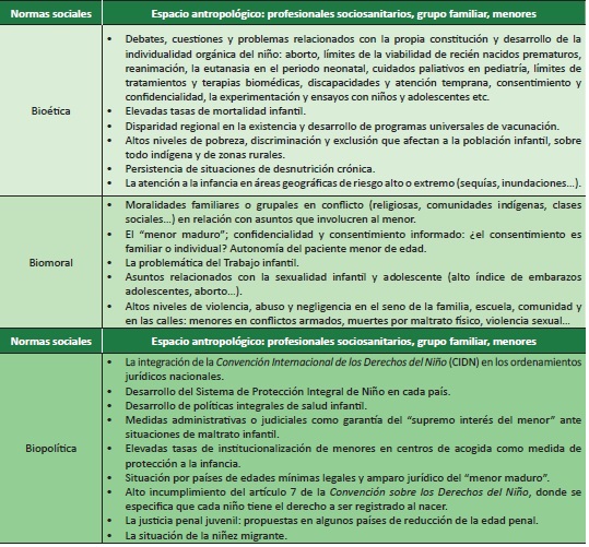 En la tabla que sigue, se ensaya un criterio de clasificación de los asuntos susceptibles de ser abordados por la bioética infantil en el espacio iberoamericano, teniendo en cuenta, por una parte, el espacio antropológico constituido por los agentes personales implicados en los asuntos bioéticos, y por otra parte, los tipos de normas sociales involucradas. Aunque no se dejaría de reconocer la ambigüedad que existe a la hora de clasificar alguno de los temas en un tipo de norma social u otra 6.