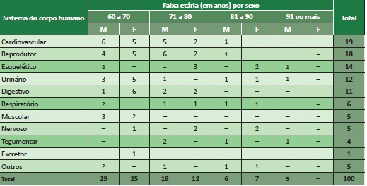 Dos 100 prontuários incluídos na amostra, 56% diziam respeito a pacientes do sexo masculino e 44% do feminino, sendo 54% dos idosos com idade entre 60 e 70 anos, 30% entre 71 e 80 anos, 13% entre 81 e 90 anos e, finalmente, 3% com 91 anos ou mais. A Tabela 1 apresenta os sistemas do corpo humano afetados que motivaram a hospitalização, relacionados à faixa etária e ao sexo dos pacientes.