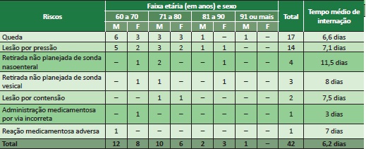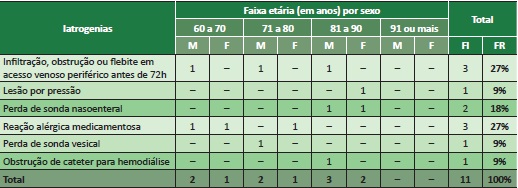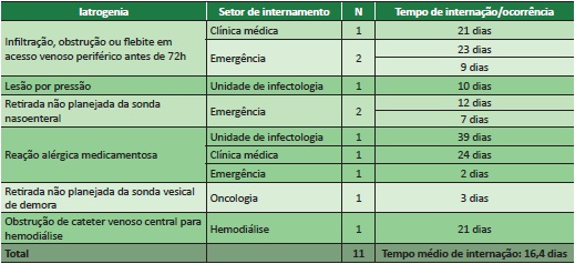 Dos 11 registros de casos de iatrogenia, 82% aconteceram em idosos com tempo de internação entre 7 e 39 dias. Apenas dois (18%) referiam-se a idosos que estiveram internados por período inferior a uma semana. Os setores que registraram atos iatrogênicos foram: emergência, com cinco ocorrências (45%); clínica médica e unidade de infectologia, com duas ocorrências cada uma (18%); e unidades de oncologia e hemodiálise, com uma ocorrência cada (9%). O tempo médio de internação foi estimado em 16,4 dias, variando de 39 dias na infectologia a dois dias na emergência.