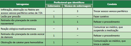 Como mostra a Tabela 4, a iatrogenia de reação alérgica medicamentosa, por exemplo, que ocorreu três vezes nos casos examinados, foi identificada pela equipe de enfermagem. Porém, como não é sua atribuição prescrever medicamentos ou suspendê-los, a equipe se limitou a comunicar o profissional responsável, assim como ocorreu no caso da obstrução de cateter para hemodiálise, em que a troca do cateter não compete ao enfermeiro.