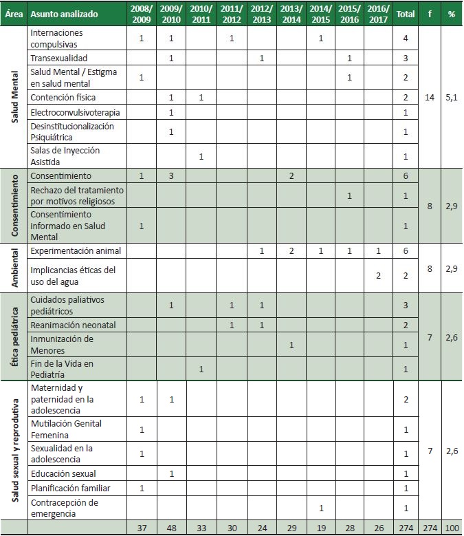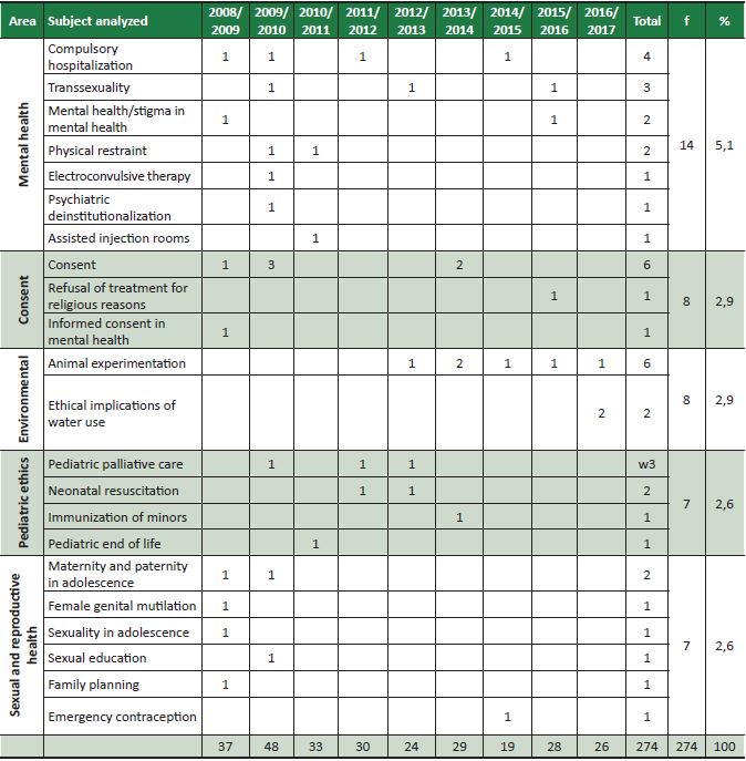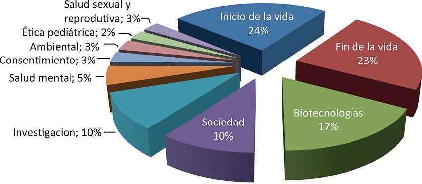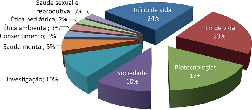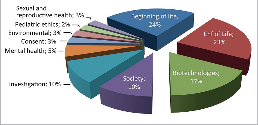 Durante os nove anos estudados, os alunos escolheram com maior frequência os seguintes itens: início de vida (interrupção voluntária de gravidez, gestação de substituição, procriação medicamente assistida), fim de vida (eutanásia, distanásia, dignidade em fim de vida). Com frequência intermediária, selecionaram biotecnologias (doação e transplante de órgãos post-mortem e inter vivos), sociedade (homoparentalidade, pena de morte) e investigação (experimentação em seres humanos, ensaios clínicos). Com menor frequência: saúde mental, consentimento, ética ambiental, ética pediátrica e saúde sexual e reprodutiva.