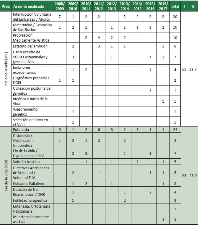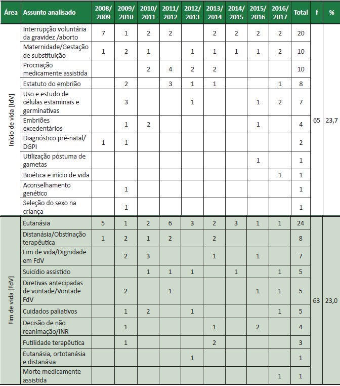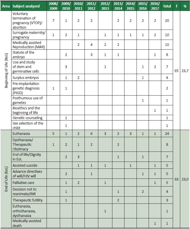 Muito próxima da temática início de vida, com 63 trabalhos (23%), a questão do fim de vida também foi escolhida em todos os anos letivos. Dos anos com escolhas mais homogêneas, em 2008/2009 e em 2011/2012 a eutanásia foi o assunto prevalente nessa área temática. Alguns surgem em 2009 e 2010 e reaparecem nos anos seguintes (como as diretivas antecipadas de vontade) ou apenas no último ano em nova formulação (morte medicamente assistida).