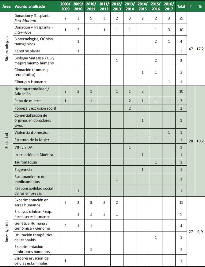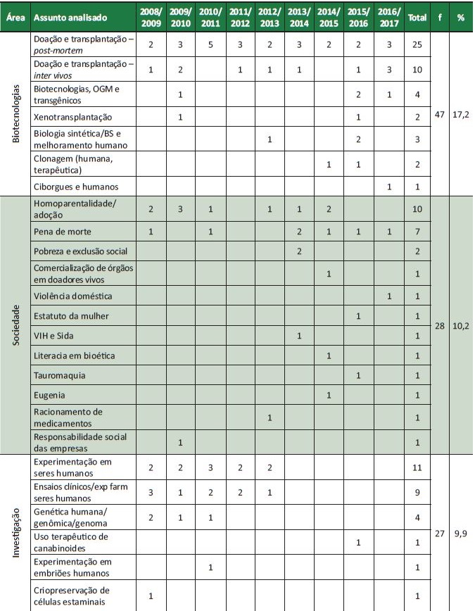 Sob esta inscrição incluímos questões bioéticas discutidas na sociedade portuguesa, como a adoção em homoparentalidade, pena de morte, comercialização de órgãos de doadores vivos, estatuto da mulher, situação VIH/sida (HIV/aids), pobreza e exclusão social, literacia em bioética (capacidade de compreender conceitos e discussão neste campo), violência doméstica, tauromaquia, eugenia, racionamento de medicamentos e responsabilidade social das empresas, em um total de 12 temas (Tabela 2).