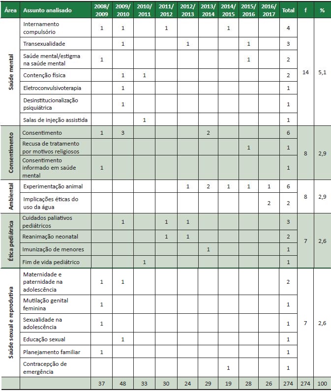 Nestes nove anos letivos, foram realizados 274 trabalhos. Os temas escolhidos representam 68 assuntos, analisados do ponto de vista das questões bioéticas. Agrupamos assuntos por afinidades em dez áreas temáticas sintetizadas a seguir.