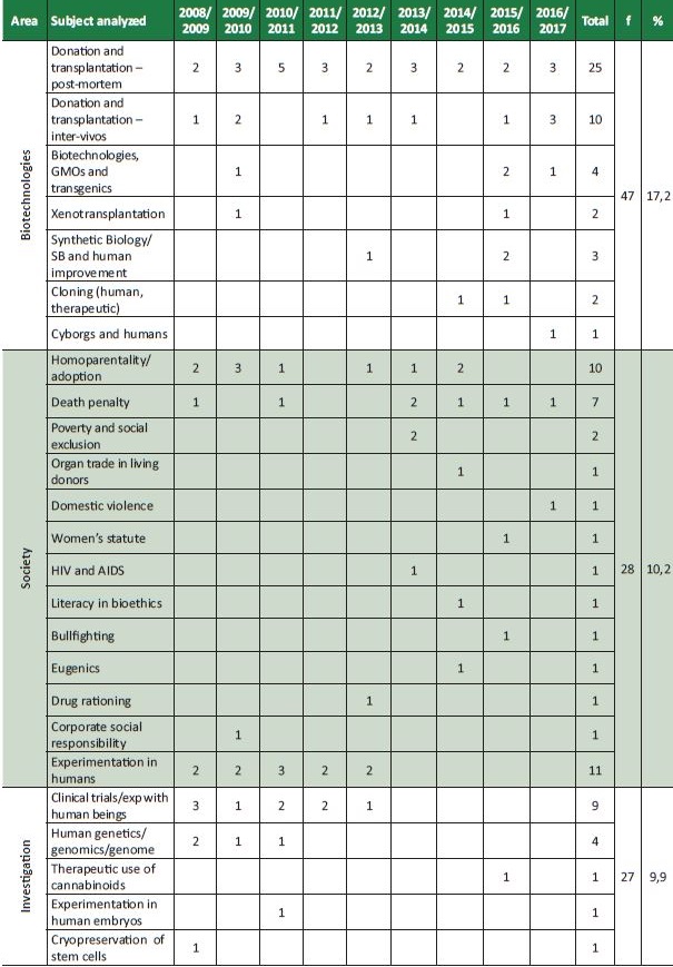 Os mais escolhidos foram morte encefálica e doação e transplante post-mortem (25), seguindo-se doação e transplantação inter vivos (10) e os associadas a organismos geneticamente modificados e biologia sintética (7). Dos anos com escolhas mais homogêneas, em 2010 e 2011 foca-se mais a doação e transplante post-mortem, tema presente nos nove anos; e em 2016 e 2017, a doação, coleta e transplante inter vivos. Há temas que aparecem já nos primeiros anos (caso dos OGM) e outros que surgem mais no final (biologia sintética, melhoramento humano, ciborgues). É visível que o número de escolhas aumenta e dispersa-se tematicamente nos últimos dois anos letivos (Tabela 2).