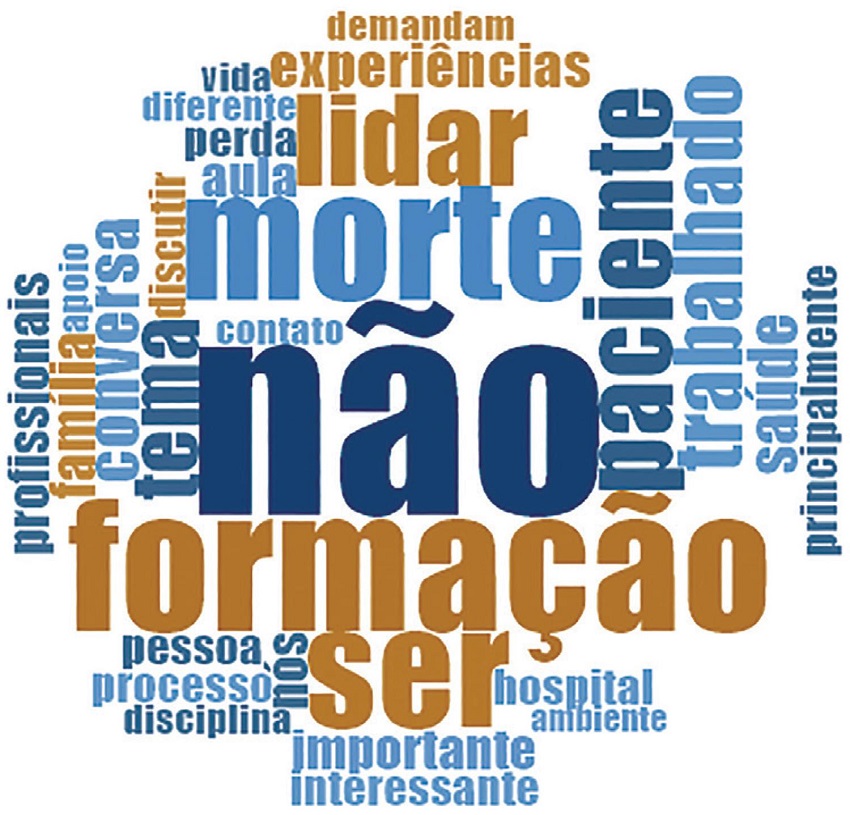 Palavras como “não”, no sentido de inexistência do preparo; “trabalhado”, no sentido de abordado durante a formação; “morte”; “lidar”, no sentido de manejo pessoal e emocional; e “formação”, no sentido educacional e profissional, foram as mais frequentes nas falas dos residentes. Breve análise permite observar que todas as palavras convergem para o sentimento de despreparo, depreendendo-se que a morte precisa ser tratada na formação do profissional de saúde com abordagem mais ampla.