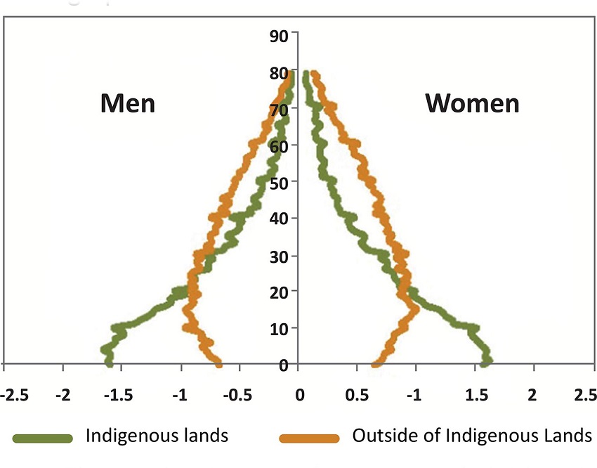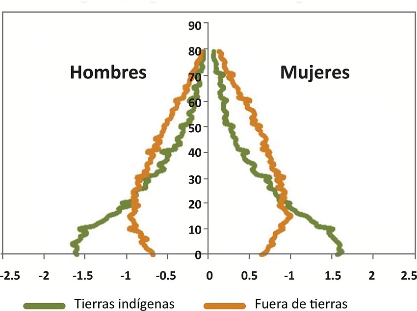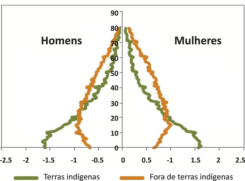 Hoje, segundo dados do último censo do IBGE realizado em 2010, a população brasileira soma 190.755.799 pessoas. Ainda segundo o censo, 817.963 são indígenas, das quais 502.783 ou 61,5% vivem em áreas indígenas e 315.180 ou 38,5% em zonas urbanas, revelando assim que estão presentes em todos os estados, inclusive no Distrito Federal. Em relação à composição de sexo e idade da população estudada, o Gráfico 1 mostra a prevalência de ambos os sexos em terras indígenas até pelo menos o início da idade adulta, e a base alargada indica alta taxa de natalidade entre as mulheres 1.
