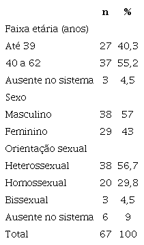 A amostra foi composta por 67 indivíduos, 38 homens e 29 mulheres, sendo a faixa etária prevalente de 40 a 62 anos (55,2%). Quanto à orientação sexual, a maioria era heterossexual, seguida de homossexuais e bissexuais (Tabela 1).