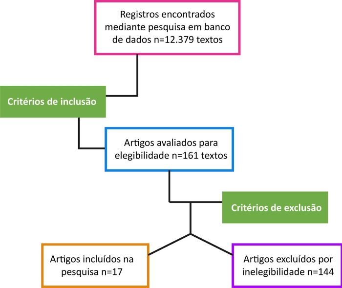 Inicialmente, foram obtidos 12.379 textos: 12.100 no Google Scholar, 223 no PubMed, 49 no Scopus e 7 na Lilacs. Depois de considerar os critérios de exclusão, restaram 70 artigos do Google Scholar, 112 do PubMed, 44 do Scopus e 5 da Lilacs: 231 no total. Entretanto, sem os textos repetidos, foram selecionados 161 artigos para leitura completa do abstract. Quando o resumo mostrou-se pertinente ao objetivo da pesquisa, o trabalho foi lido na íntegra. Por fim, foram selecionados 13 textos do Google Scholar, 1 da Lilacs, 1 do PubMed e 2 do Scopus, reduzindo o corpus a 17 artigos científicos, como mostram a Figura 1 e a Tabela 1.