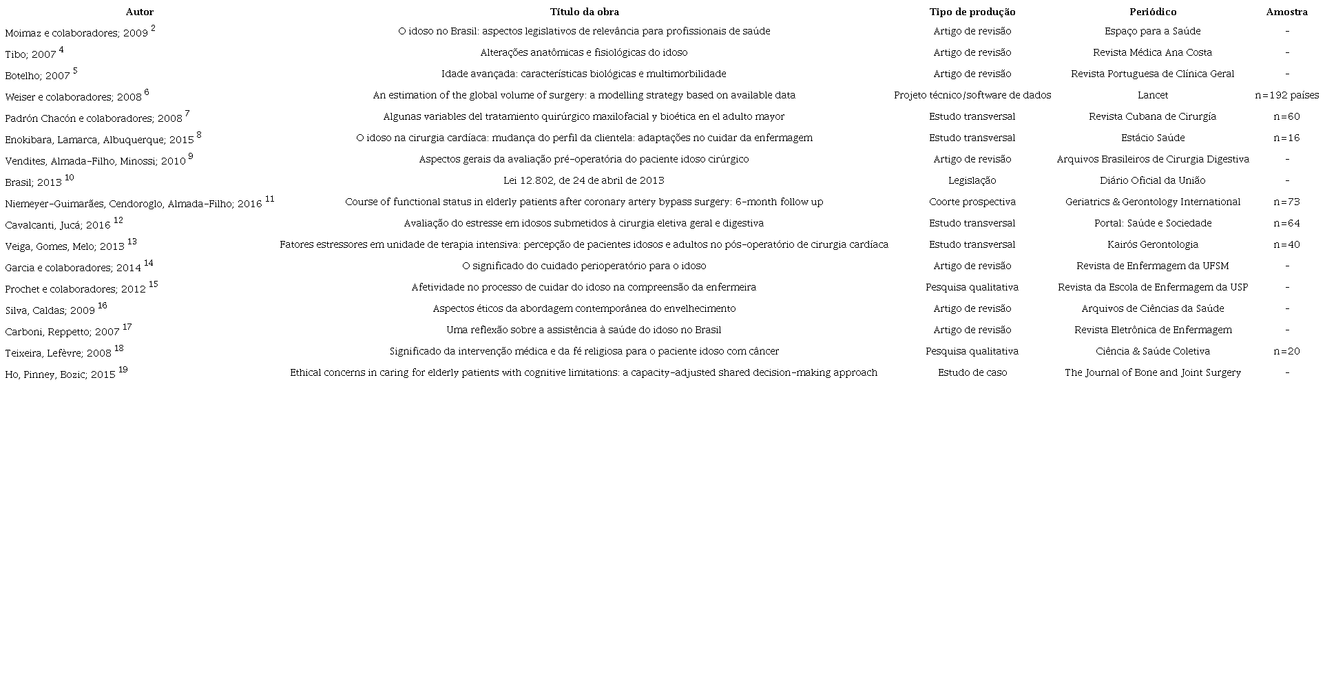 Os artigos selecionados abordaram aspectos legislativos relevantes para profissionais de saúde, alterações anatômicas e fisiológicas do idoso e multimorbidade, mudança no perfil da clientela e quantidade de cirurgias, aspectos gerais da avaliação pré-operatória e questões do cuidado de idosos em condições perioperatórias. Os 17 textos estavam divididos da seguinte forma: sete artigos de revisão, quatro estudos transversais analíticos, um projeto de desenvolvimento de software de dados, duas pesquisas qualitativas, um estudo de caso, uma aplicação de legislação e um estudo de coorte (Quadro 1).