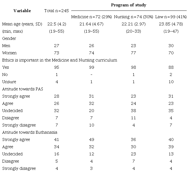The demographic characteristics of the sample are shown in table 1. The majority of the students were women (73%), 59% attending medical or nursing studies and 41% law studies. No significant differences were found between disciplines in terms of age or gender. A large percentage of students (95%) considered ethics an important subject in the health sciences curriculum.