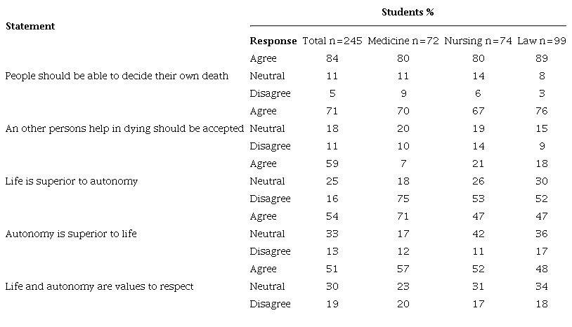 This paper analyzed the attitudes and intentions of medical, nursing and law students towards PAS and E. An objective evaluation of the results indicates that a majority of respondents exhibited a positive attitude towards PAS (54%) and E (75%), which agrees with other studies carried out in the USA 19,20 and Mexico 25, and in some European countries such as the Netherlands 21, Hungary 22, Switzerland 23, Greece 24 and Belgium 26. The cultural context, religious beliefs and personal philosophy have been found to be related to attitudes 26,35,40,42. The present study revealed greater support for E than PAS, which is unusual and contrasts with previously published reports. It is to be expected that helping a patient take her or his own life is more acceptable than the physician directly taking such a life.