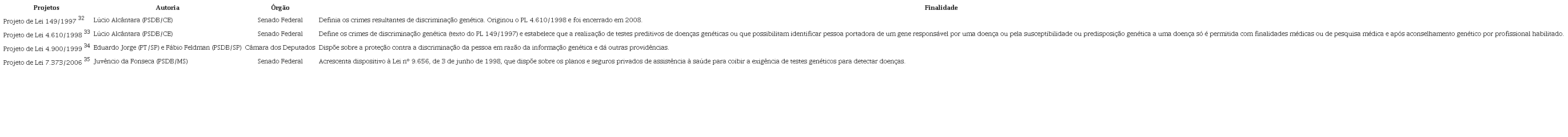 Diversos PL sobre conhecimento genético humano e seu uso foram propostos, quatro deles, de 1997 32, 1998 33, 1999 34 e 2006 35, especificamente sobre discriminação e testes genéticos. Porém, projetos específicos sobre mapeamento genético não foram identificados na pesquisa realizada. O Quadro 1 caracteriza os PL localizados e seus objetivos.