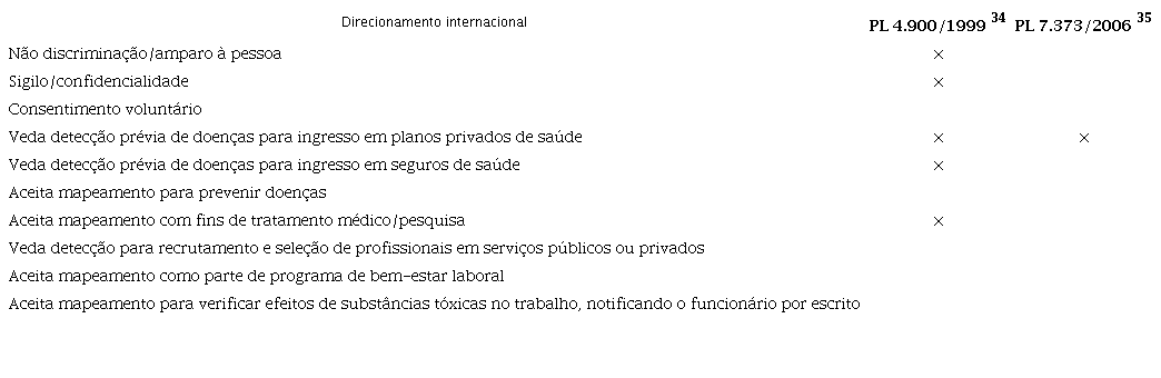 Os PL brasileiros sobre o tema buscam alicerçar os parâmetros da não discriminação e do sigilo dos dados genéticos. Embora os contemplem minimamente, demonstram cuidado para não ferir a dignidade e o respeito à individualidade.