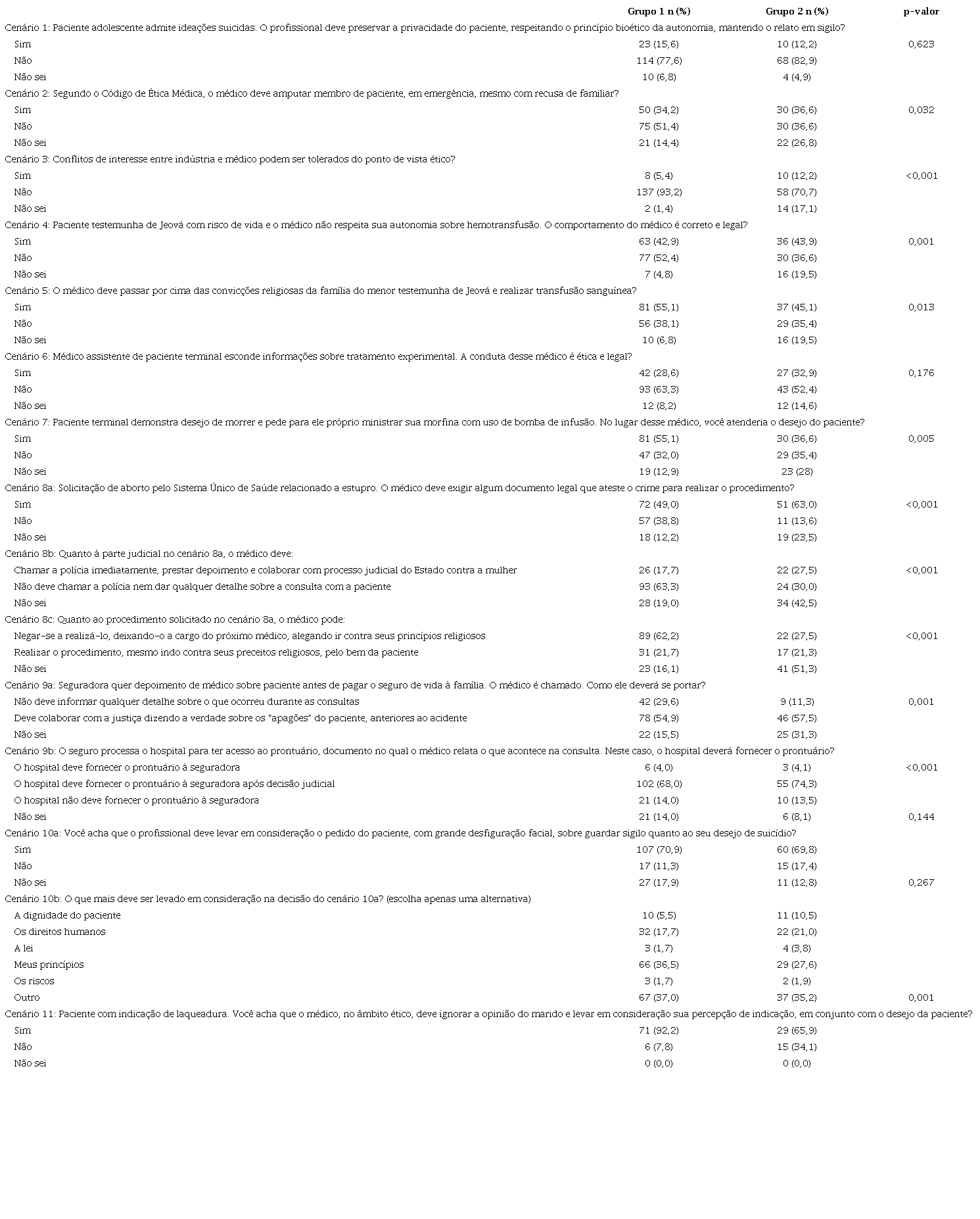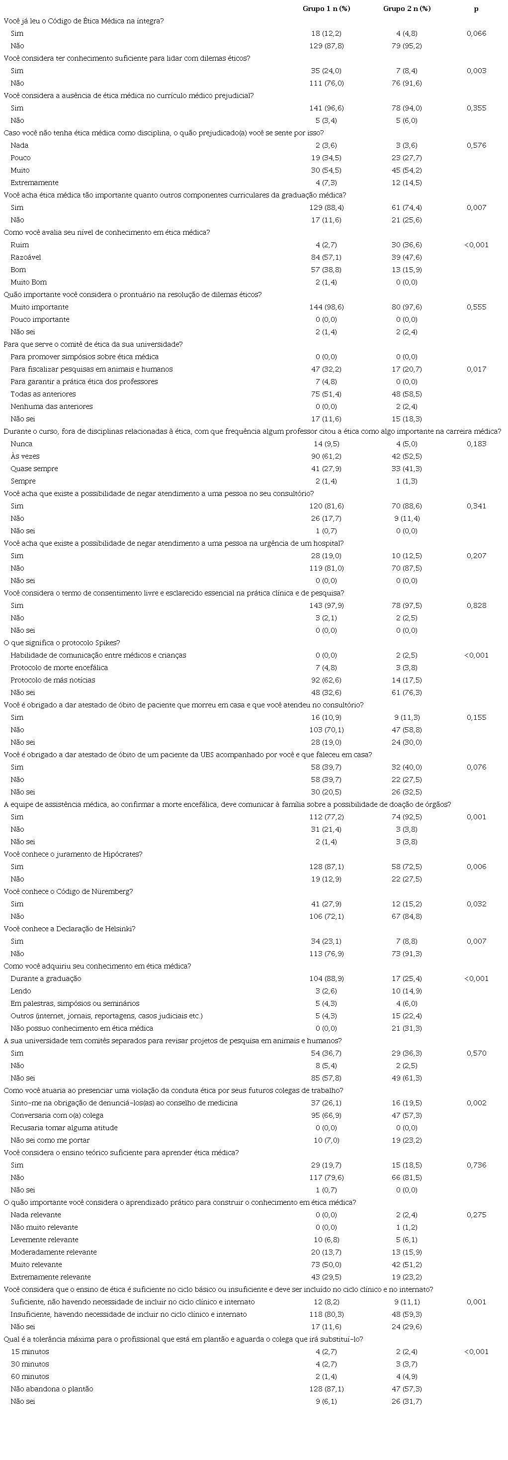 Os alunos foram divididos em dois grupos: 147 (63,9%) estudantes que cursaram a disciplina Ética Médica e Habilidades de Comunicação ou Medicina Legal, Deontologia e Perícia Médica compuseram o G1; e 83 (36,1%) que não cursaram matérias envolvendo ética médica compuseram o G2. De todos os respondentes, 7,9% disseram que os professores das demais disciplinas nunca citaram questões relacionadas à ética médica como algo importante para o desempenho profissional, contra 1,3% que afirmou que os docentes sempre enfatizaram esse tópico. A Tabela 1 compara os resultados entre G1 e G2.