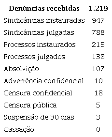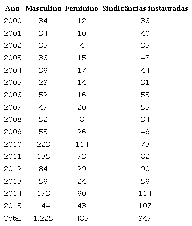 Entre 2000 e 2015, 1.219 denúncias foram recebidas, média de 76,19 por ano (DP=25,54), com o ano de 2010 apresentando o menor número de denúncias (37; 3,03%), e 2015 o maior (120; 9,84%). Das denúncias apresentadas, foram apuradas 778 sindicâncias, com média de 49,25 procedimentos por ano (DP=28,12) ( Tabela 1 ).