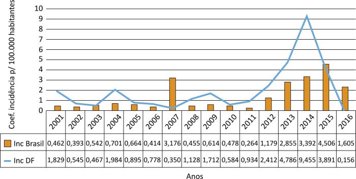 A partir de 2015 a incidência no Distrito Federal cai para menos da metade (3,89) em comparação com o ano anterior (9,45), que apresenta o maior índice nessa série histórica. Tal queda permaneceu em 2016 (0,16), e o Distrito Federal registrou coeficiente 10 vezes menor que o nacional, apesar do registro de queda em todo o território brasileiro: entre 2015 e 2016 foram notificados quase três vezes menos casos no país.
