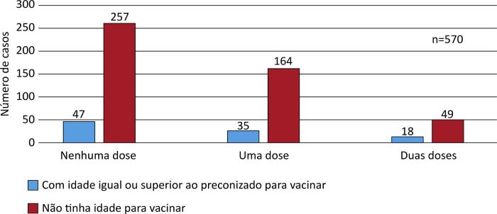 Quanto à faixa etária dos acometidos por coqueluche sem esquema básico de vacina completo, 64,91% (370 dos 570 casos) não tinham idade para a dose faltante. Dos 304 que nunca receberam vacina, apenas 47 (15,46%) tinham mais de 2 meses de idade, o que reforça a importância de imunizar a gestante ou a puérpera para proteger recém-nascidos até pelo menos a primeira dose do esquema básico. Dos 199 registros com apenas uma dose, 82,41% (164) não tinham idade para a segunda; e dos 67 que receberam duas doses da vacina, 18 (26,87%) já estavam em idade para completar o esquema, oito deles com menos de 7 meses ( Figura 2 ).