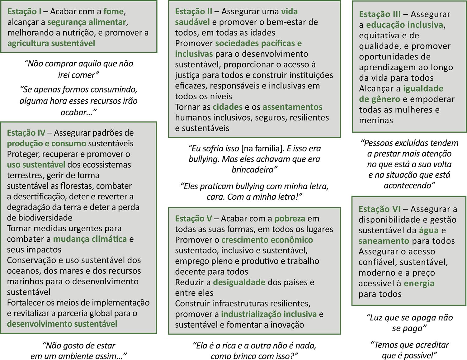 Os discentes reagiram aos ambientes perturbadores, sentindo-se incomodados com o lixo no chão e desconcertados quando convidados a recolher os resíduos em um local que não tinha lixeira compatível. Da mesma forma, surpreenderam-se ao encontrar, em vez de água, um pequeno pedaço de carne na caixa d’água. Muitos tinham dificuldade para falar do futuro, característica apontada nas pesquisas de Fischer e colaboradores 5, segundo as quais essa dificuldade de lidar com questões ambientais está relacionada a conflitos pessoais, transformações físicas e emocionais próprias dessa fase da vida. Fica claro a atenção que deve ser dada a temas como inclusão e bullying diante da reação dos alunos a situações em que fica exposta a vulnerabilidade de um jovem excluído por impulso automático, como vivenciado na estação da educação ou na formação de pares na estação da vida.