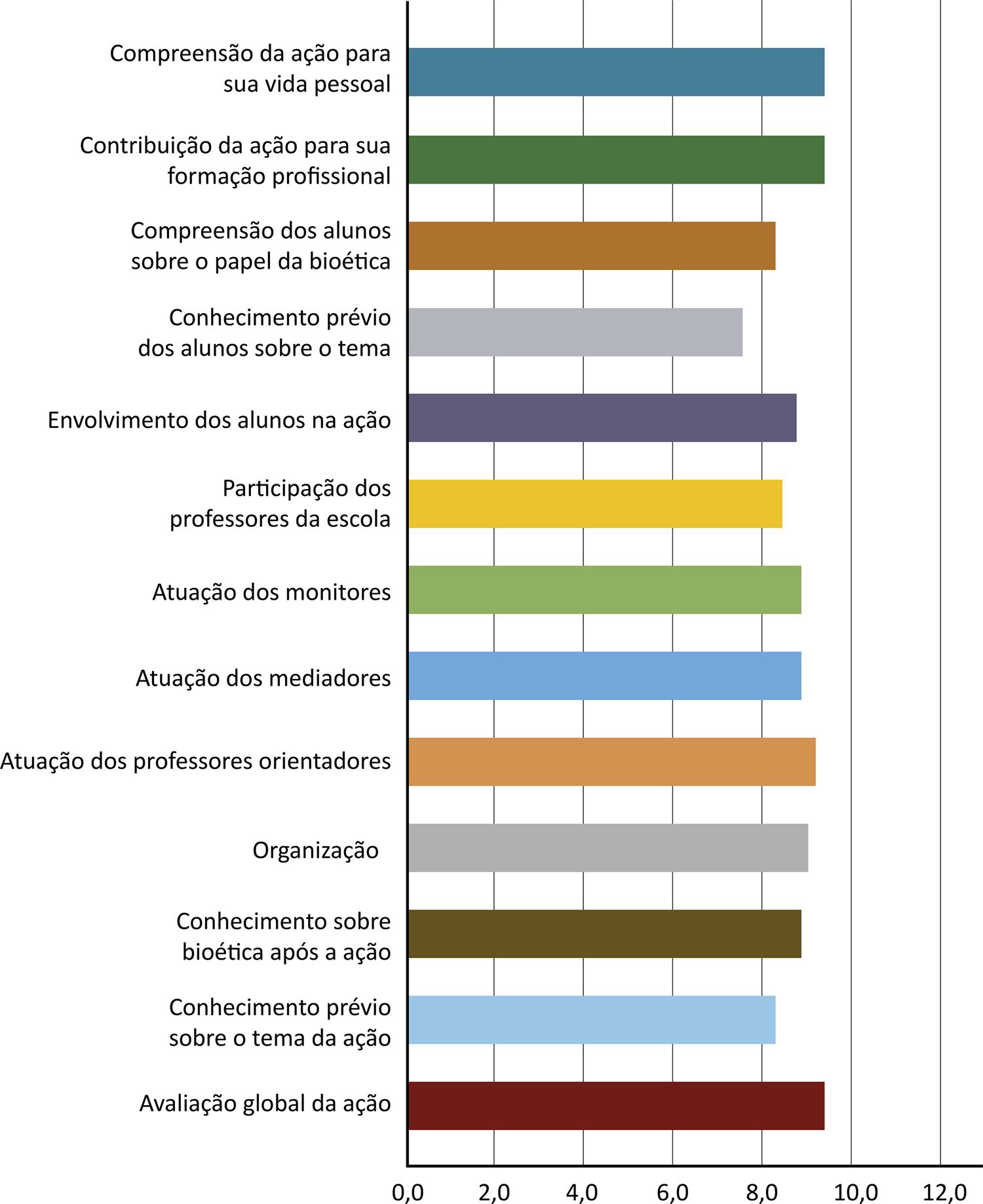 Responderam ao questionário 23 alunos da graduação (11 de biologia, 3 de teologia, 1 de ciências sociais, 1 de educação física, 6 de nutrição e 1 de psicologia), 12 mestrandos (8 de bioética, 1 de teologia, 2 de odontologia e 1 de direito), 5 mestres do PPGB e 4 docentes da PUCPR, que atribuíram valores superiores a 8 para todos os itens de avaliação (Figura 1), superando aqueles com menor valor na primeira fase da intervenção (avaliação da organização, participação e contribuição dos estudantes), assim como os valores conferidos a seus próprios conhecimentos antes e após a intervenção 18.