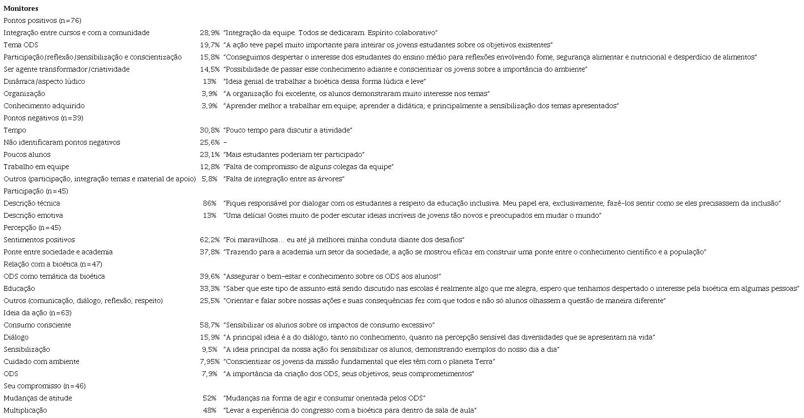 O ponto positivo mais citado espontaneamente pelos respondentes foi a integração entre os cursos e escolas da instituição, entre estudantes, graduandos, mestrandos e docentes, e entre academia/comunidade, como pode ser atestado em alguns exemplos (Tabela 1). Esses resultados corroboram os obtidos na intervenção anterior 18, cujos participantes demonstraram satisfação em trabalhar em projeto comunitário, construção conjunta em prol de valores comuns, no caso, o outro, o planeta e o futuro.