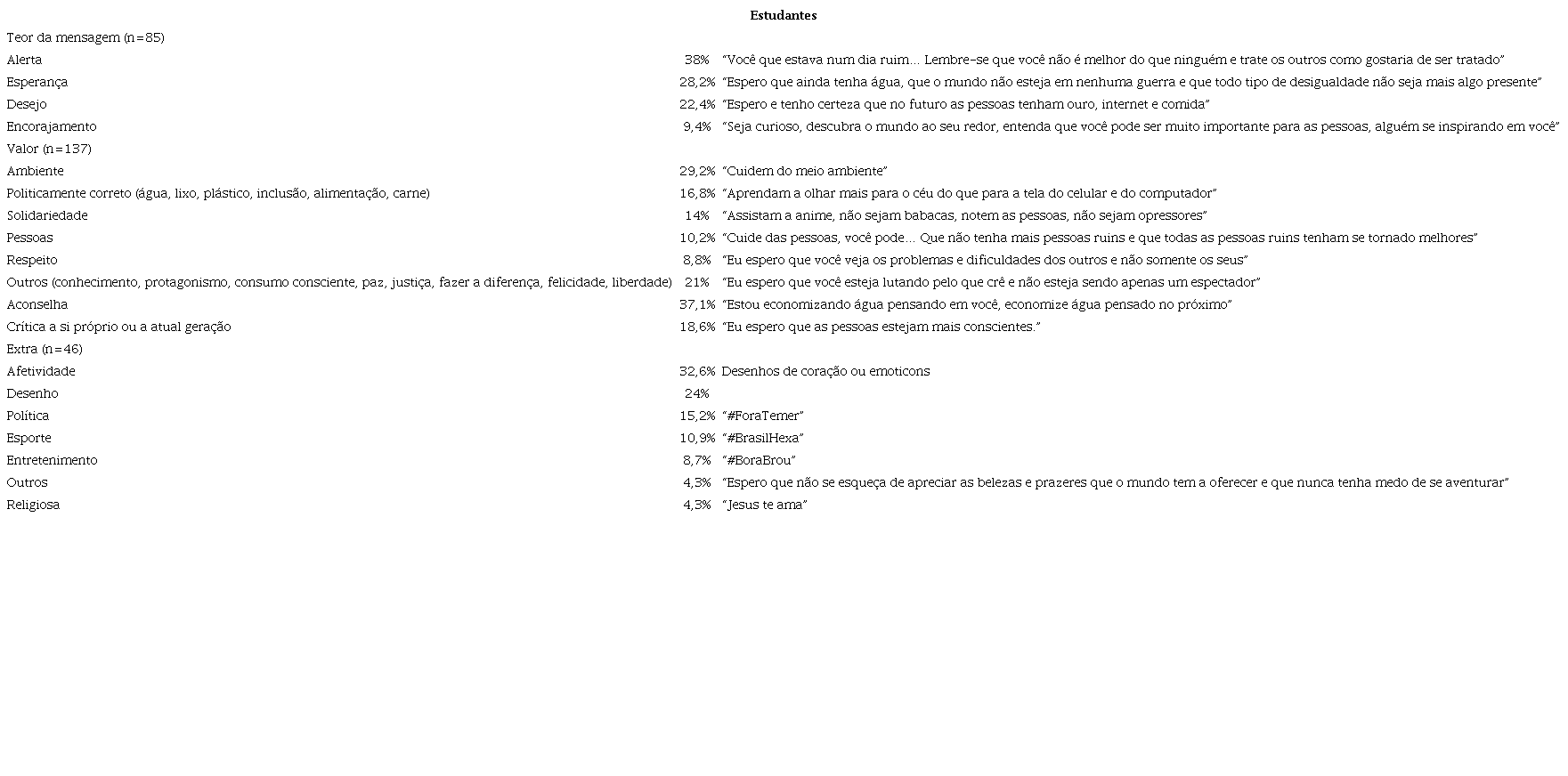 Foram analisados os recados deixados para o jovem do futuro (Tabela 2), com destaque para o meio ambiente e ações consideradas politicamente corretas, associadas às temáticas discutidas, como água, lixo, plástico, inclusão e alimentação. Contudo, foram incorporadas também questões de solidariedade, preocupação com o ser humano e respeito (Tabela 2). Fischer e colaboradores 5 alertam para a importância das vivências para o amadurecimento moral dos jovens, influenciado por outros indivíduos da mesma idade ligeiramente mais desenvolvidos moralmente.
