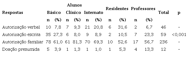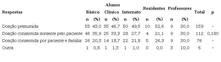 A maioria dos participantes concordou total ou parcialmente que o principal critério deveria ser a vontade manifestada em vida pela pessoa, independentemente da autorização familiar. Entre estes, 104 (81,3%) eram estudantes do ciclo básico, 62 (82,7%) do clínico, 82 (81,2%) do internato, 15 (78,9%) residentes e 25 (83,3%) professores. Uma minoria discordou totalmente dessa afirmação: 12 (9,3%) alunos do ciclo básico, cinco (6,7%) do clínico, cinco (4,9%) do internato, dois (10,5%) residentes e três (10%) professores, sem significância estatística (p=0,740).