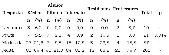 Quanto ao contato com temas de DAV durante a graduação, responderam negativamente 115 (89,8%) participantes do ciclo básico, 13 (17,3%) do clínico, quatro (3,9%) do internato, 12 (63,2%) residentes e 24 (80%) professores (p<0,001).