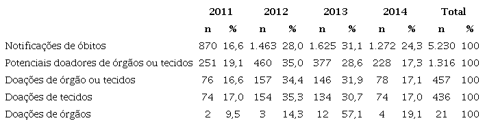 Na revisão da literatura sobre o tema, observou-se escassez de dados sobre doações de órgãos e tecidos no Brasil nesta década, o que dificulta comparações. No entanto, neste trabalho o que se constatou foi um número de potenciais doadores muito superior (n=1.316) ao de doadores efetivos (n=439). Além disso, as doações oscilaram nos anos estudados, e diminuíram no último ano analisado (2014) em relação ao segundo ano da série (2012).