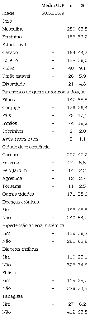 Na Tabela 2 encontra-se a média de idade dos doadores (50,5±16,9), com predomínio do sexo masculino (63,8%). Quanto ao estado civil, prevaleceram os casados (44,2%), seguidos pelos solteiros (36%). A doação foi autorizada na maioria das vezes por filhos (33,5%) ou cônjuge (29,4%). Com relação à cidade de procedência, a maior parte dos doadores foi de Caruaru (47,2%), mas pacientes de cidades vizinhas, como Bezerros (5,5%) e Belo Jardim (3,2%), também aparecem na amostra. Quanto às doenças crônicas, 45,3% da amostra apresentou alguma enfermidade, 36,2% hipertensão arterial, e 25,1% diabetes mellitus. O etilismo acometia 25,7% dos doadores, e o tabagismo apenas 6,2%.