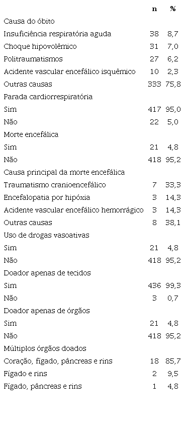 Este estudo também caracterizou o perfil dos doadores de órgãos ou tecidos. Entre eles, foi constatado predomínio de pessoas do sexo masculino, casadas, com média de idade de 50,5 anos. Na maioria dos casos, os filhos foram responsáveis por autorizar a doação. Quanto ao óbito, o traumatismo cranioencefálico foi a causa mais frequente de morte encefálica. Por outros motivos, desconsiderando a morte encefálica, a causa mais comum foi a insuficiência respiratória aguda.