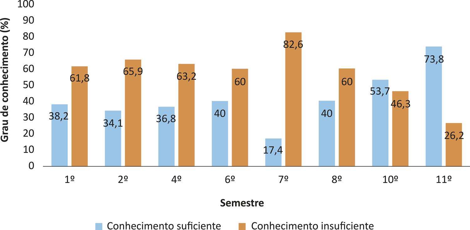 O conhecimento suficiente dos estudantes oscilou entre os semestres, sendo maior no décimo primeiro (73,8%) e menor no sétimo (17,4%). Quanto ao conhecimento insuficiente, predominou no primeiro ao oitavo semestre, com pequenas oscilações, e declínio no décimo e no décimo primeiro semestres, como mostra o Gráfico 1.