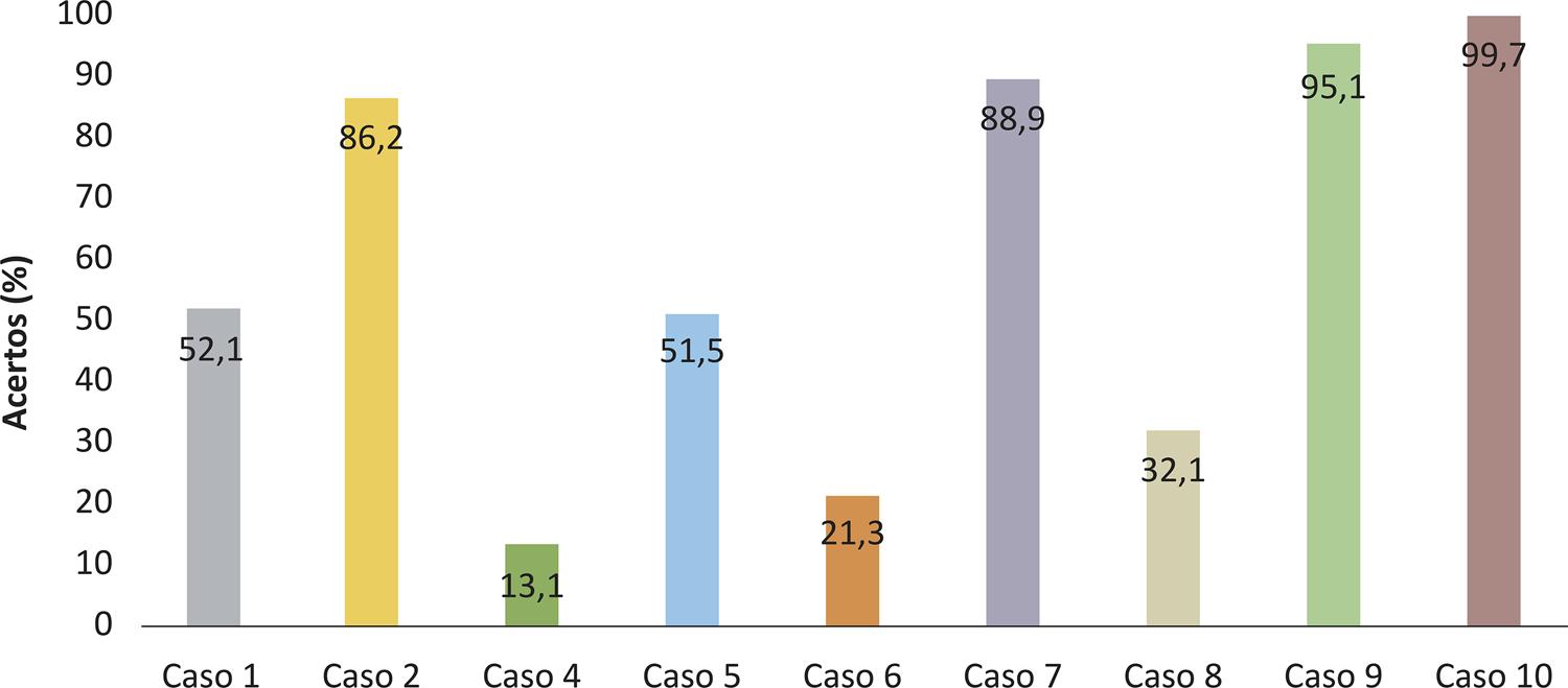 Quanto aos casos-problema, o Gráfico 2 mostra que o caso 10, referente ao estudante que publica foto do prontuário de paciente nas redes sociais, foi o que teve mais respostas corretas, 304 (99,7%). Por outro lado, o caso 4, sobre médico que participa de congresso e expõe o caso clínico com detalhes identificáveis do enfermo, ainda que com autorização prévia, foi respondido incorretamente por 264 (86,6%) estudantes.