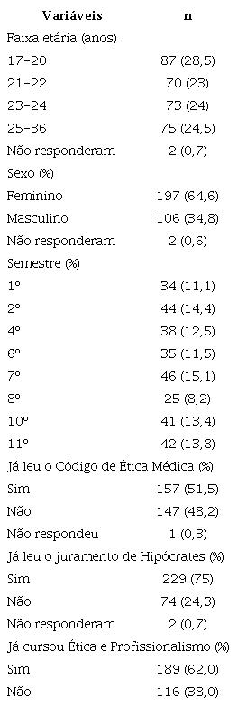 Como apresentado na Tabela 1, o questionário foi respondido por 197 (64,6%) estudantes do sexo feminino, e a idade variou de 17 a 36 anos, com média de 22,8 anos e desvio-padrão de 3,7 anos, sendo maior a concentração entre 17 e 20 anos. A maioria – 46 alunos (15,1%) – era do sétimo e a minoria – 25 (8,2%) – do oitavo semestre. Em relação ao contato dos discentes com referências que orientam sobre ética médica e sigilo profissional, 157 (51,5%) referiram ter lido o CEM, 229 (75,1%) o juramento de Hipócrates e 189 (62%) já tinham cursado a disciplina Ética e Profissionalismo, oferecida no quinto semestre do curso.