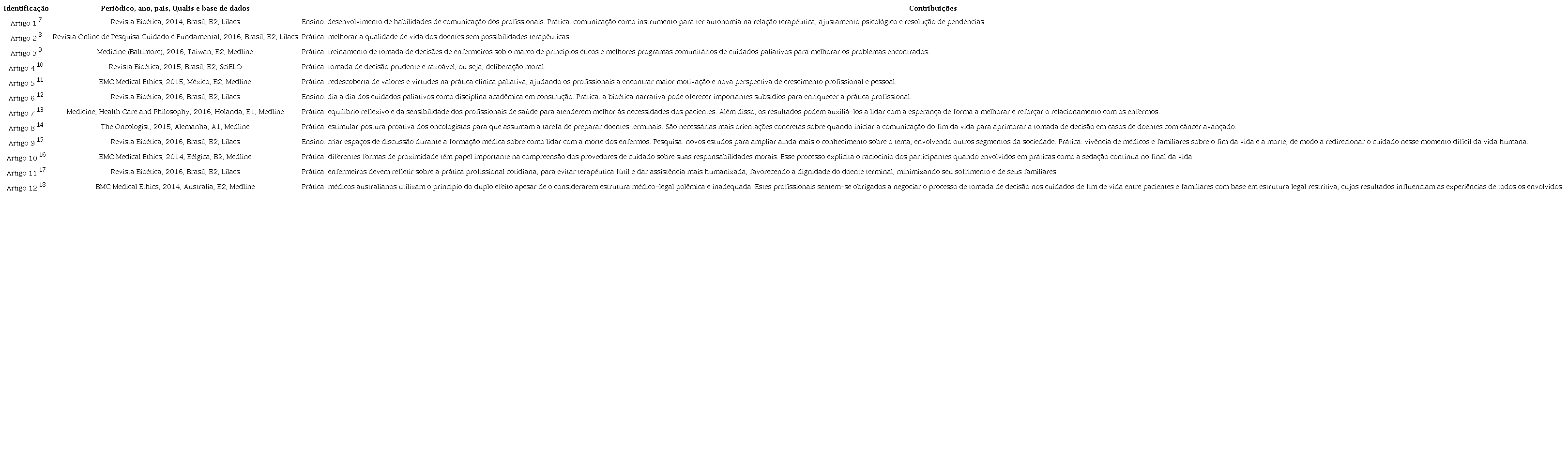 A amostra foi composta por 12 artigos, sendo 2016 e Brasil o ano e o país com maior representatividade, com metade das publicações, predominando a abordagem qualitativa. A qualidade da produção intelectual das revistas, segundo o Qualis Periódicos, variou entre A1 e B2. Quanto aos participantes das pesquisas, os artigos estavam divididos da seguinte forma: sete envolviam equipe multiprofissional, familiares, cuidadores e pacientes, três apenas médicos e dois somente enfermeiros (Tabela 1).