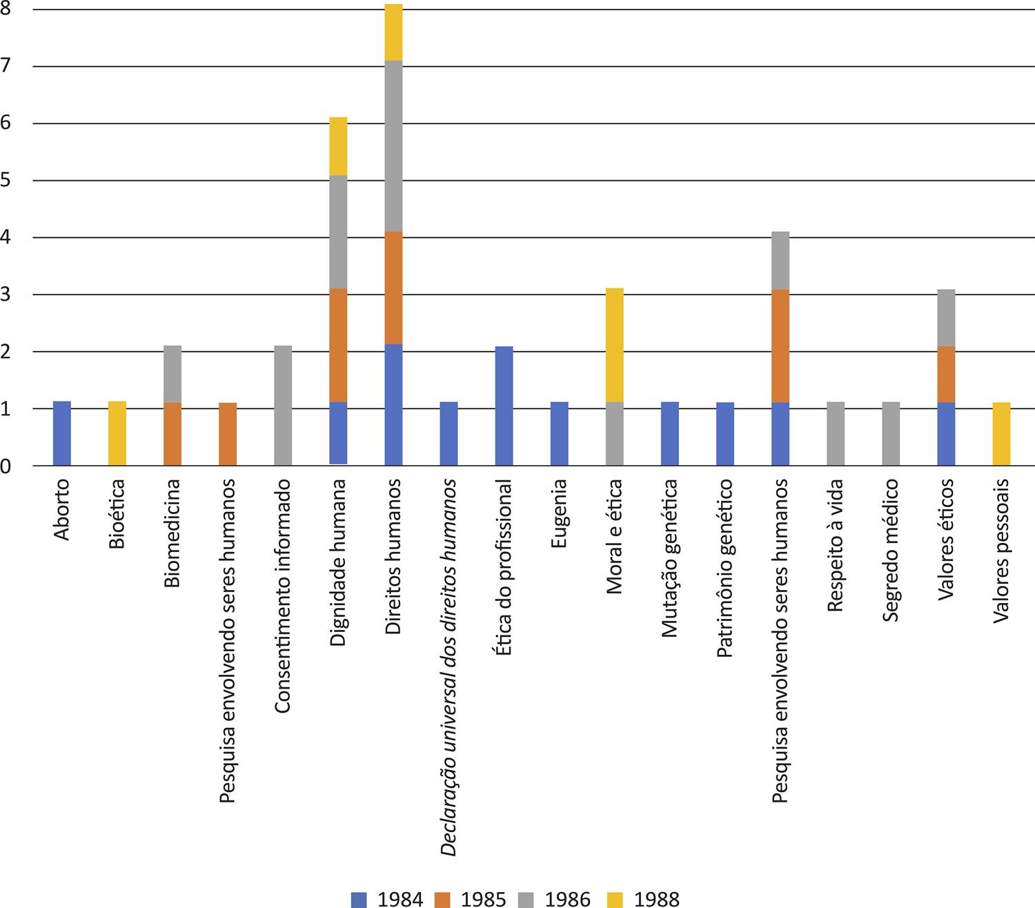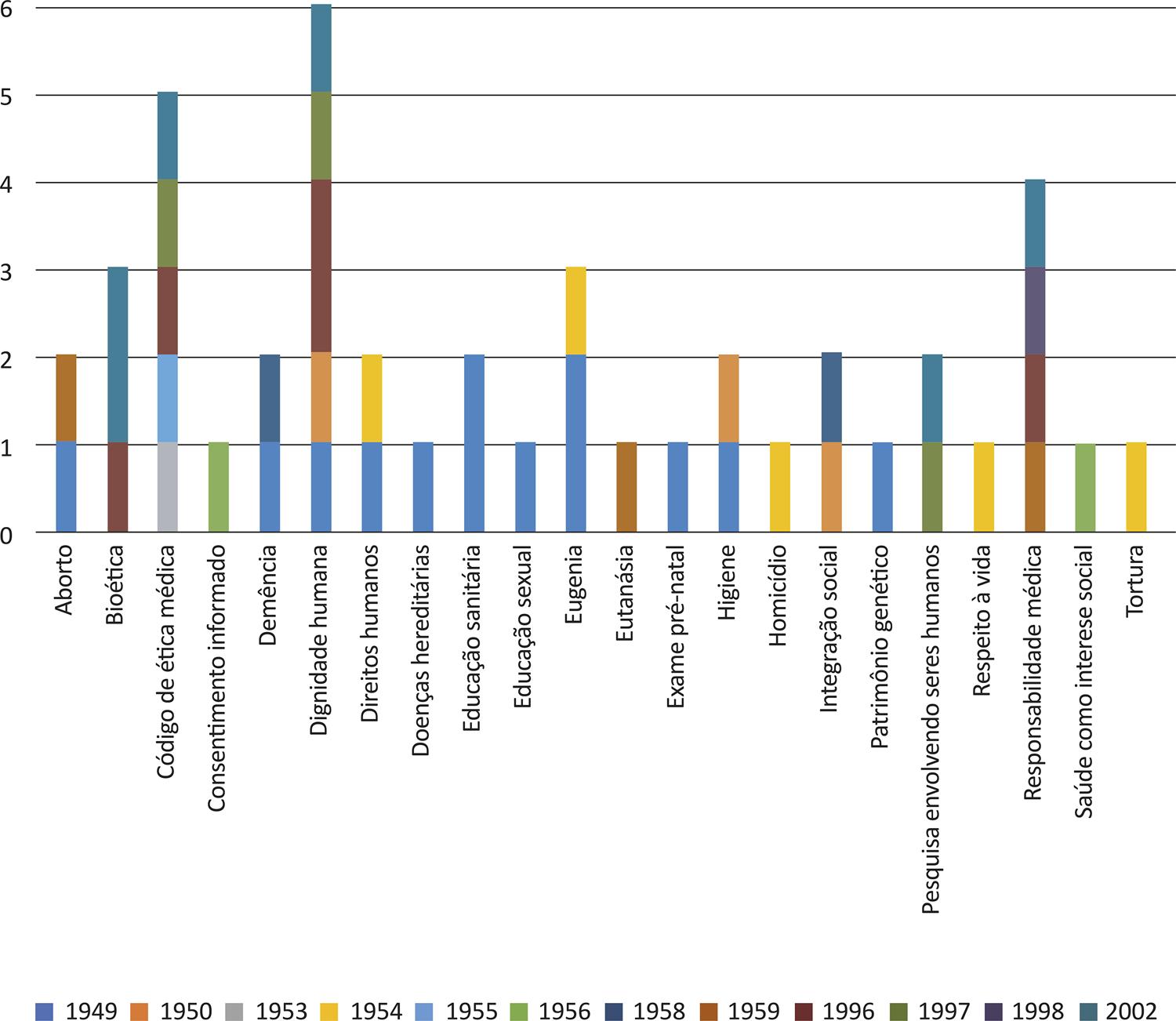Situações sociais e médicas envolvendo crianças, jovens ou idosos e equipes multidisciplinares tornam-se assunto a partir da década de 1970. Essa mudança no teor dos textos mostra a aproximação entre o profissional e os problemas em voga no país 9,11,12, indicando proposições éticas aceitáveis pela classe médica e pela sociedade. O Gráfico 1 mostra que os temas mais divulgados foram dignidade humana, códigos de ética e responsabilidade médica. Até os anos 1950 prevalecia o debate sobre educação social e sanitária, e posteriormente foram incorporadas discussões éticas relacionadas aos direitos humanos.